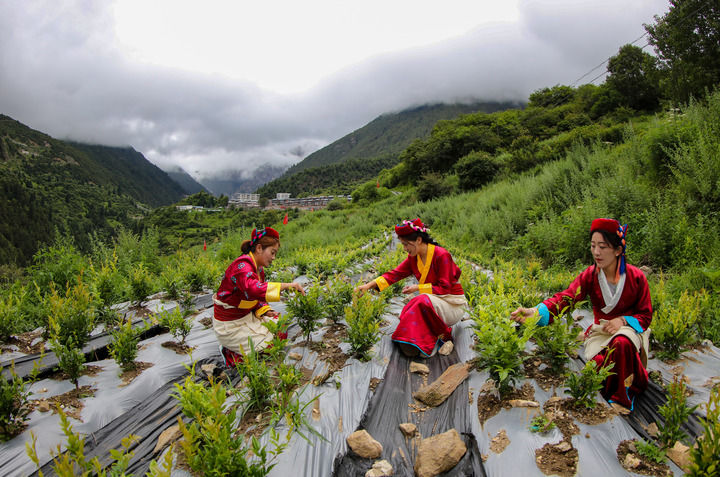 2022年,安徽省援藏工作隊在勒布溝引入莓茶種植,試驗性種植30畝。這是當?shù)卮迕裨诓烧瑁?023年7月28日攝)。新華社記者 旦增尼瑪曲珠 攝