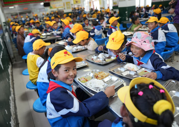 西藏林芝市工布江達縣娘蒲鄉(xiāng)中心小學(xué)學(xué)生在食堂用餐(2024年9月3日攝)。新華社記者 晉美多吉 攝