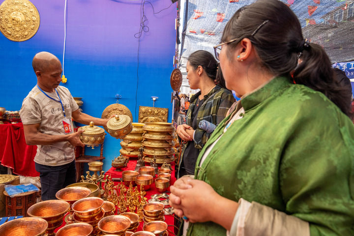 來自尼泊爾的商人阿曼在西藏昌都市首屆尼泊爾進口商品展銷會上向顧客展示商品(2024年8月19日攝)。新華社記者 旦增尼瑪曲珠 攝