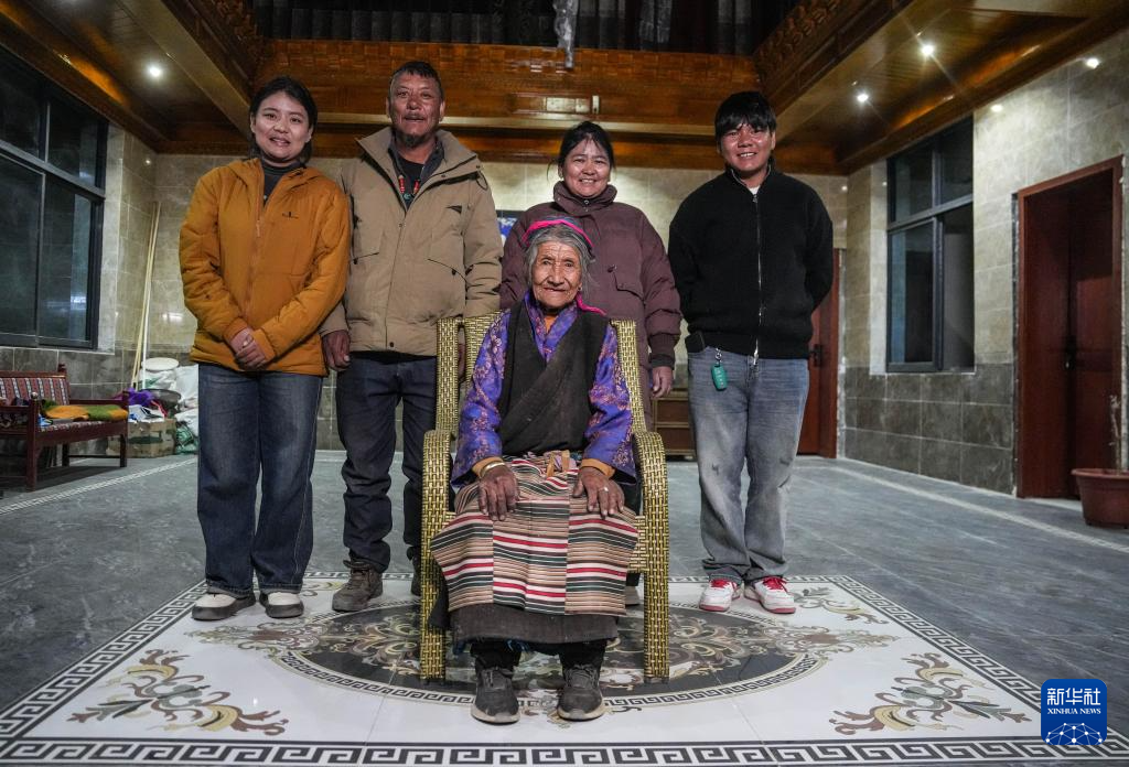 格桑美多老人(前)和家人的合影(3月12日攝)。新華社記者 晉美多吉 攝