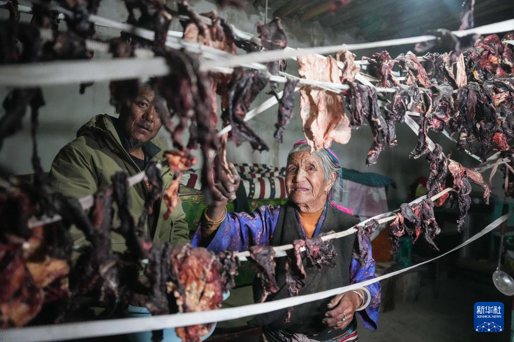 3月12日,格桑美多老人(右)拾取家里曬的風(fēng)干牛肉。新華社記者 晉美多吉 攝