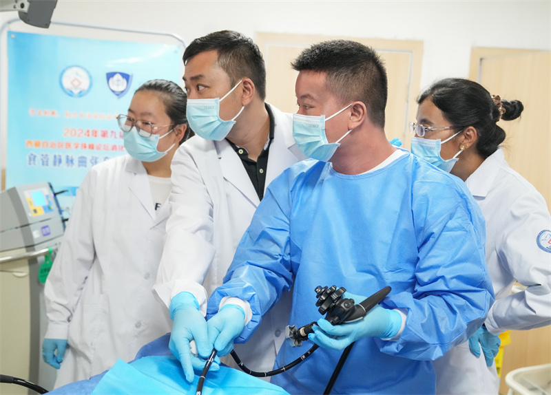 7月8日,在西藏日喀則市人民醫(yī)院,第九批醫(yī)療人才“組團(tuán)式”援藏專家、復(fù)旦大學(xué)附屬中山醫(yī)院內(nèi)鏡中心副主任醫(yī)師胡健衛(wèi)(左二)指導(dǎo)徒弟張武(左三)進(jìn)行內(nèi)鏡手術(shù)。新華社記者 丁汀 攝/新華社圖片庫(kù)