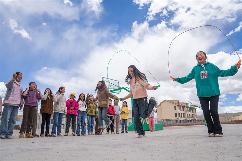6月22日,西藏那曲市班戈縣中石化小學(xué)學(xué)生在操場(chǎng)上跳繩。作為目前全國(guó)海拔最高的援藏小學(xué),班戈縣中石化小學(xué)有“離天空最近的援藏小學(xué)”之稱。新華社記者 丁增尼達(dá) 攝/新華社圖片庫(kù)