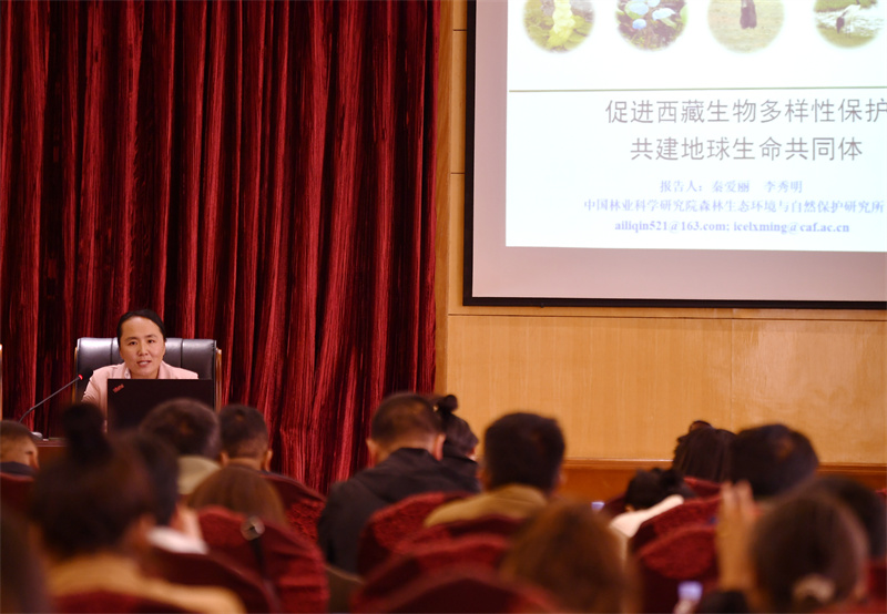 2023年9月5日,以西藏生物多樣性保護(hù)科普暨生態(tài)護(hù)林員探訪傳播為主題的林草科普援藏活動(dòng)在西藏拉薩舉行,中國(guó)林業(yè)科學(xué)研究院副研究員秦愛麗為與會(huì)人員作生物多樣性保護(hù)知識(shí)講座。新華社記者 張汝鋒 攝/新華社圖片庫(kù)