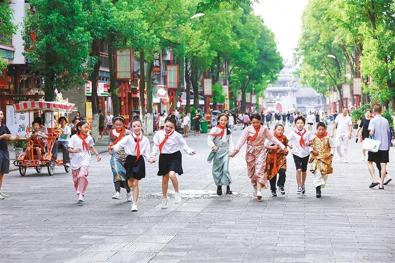 圖為藏渝兩地學(xué)生手牽手奔跑在山城街頭。 通訊員 擁金卓嘎 攝