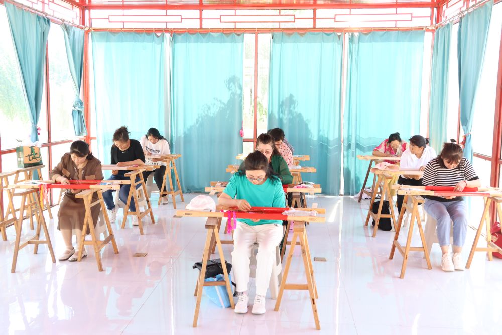 在古色古香的蒙古族刺繡車間內,繡娘們一會兒飛針走線,一會兒相互聊天,漢族繡工向蒙古族繡工傳授經驗,蒙古族繡工又向朝鮮族繡工分享技藝,大家切磋工作、聊聊家常,氛圍和諧。
