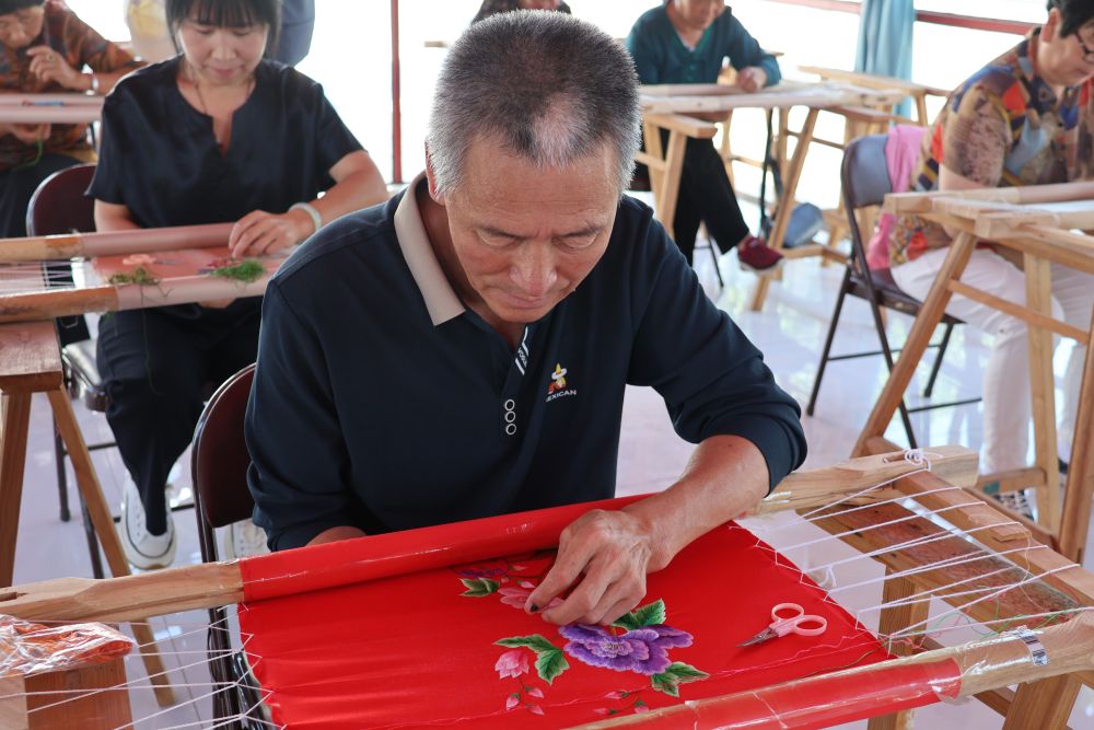 車間里,來自不同民族的繡工在交流和學習中,不僅精進了繡法,也在傳承中華優(yōu)秀傳統(tǒng)文化中找到了更多共鳴,“同心同圓”等象征民族團結的繡品表達著他們的心聲。
