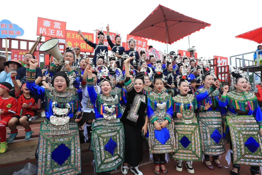 2024年5月4日,在貴州省黔東南苗族侗族自治州榕江縣“村超”球場,當?shù)厝罕娚碇⒀b為本村球隊加油鼓勁。新華社發(fā)(楊成利 攝)