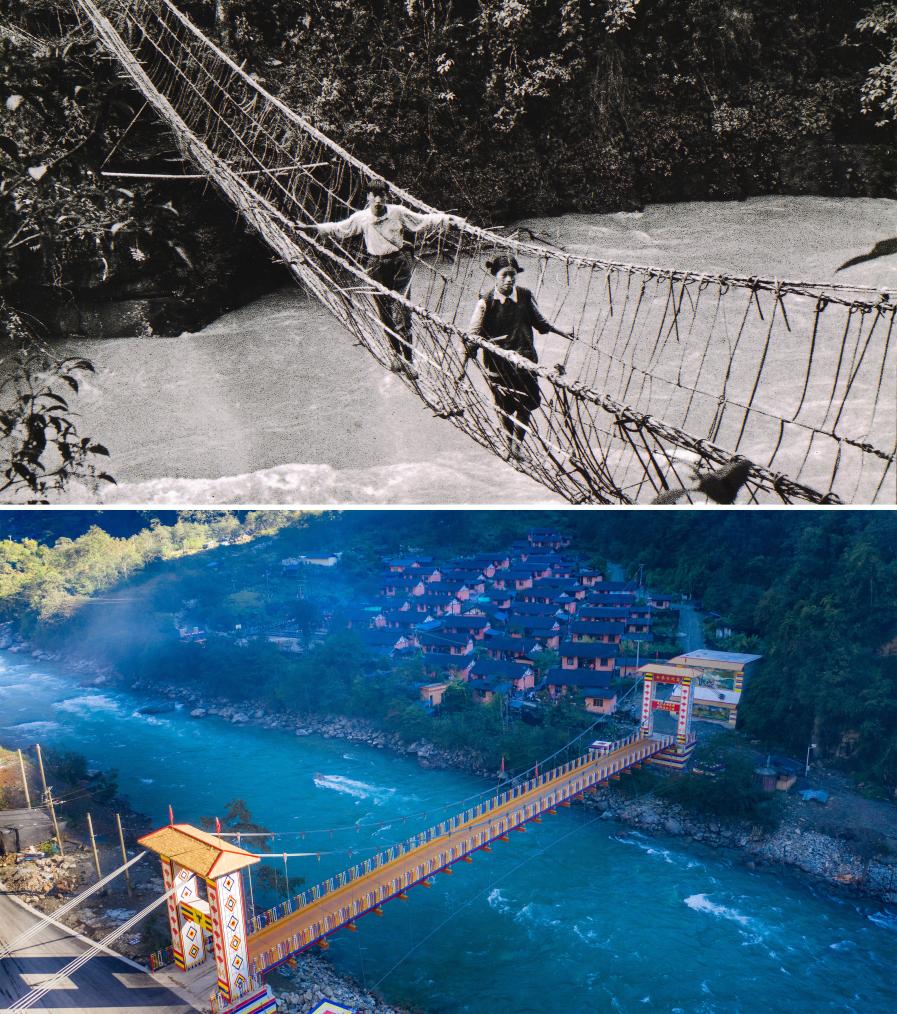 拼版照片:上圖為獨龍族群眾通過藤蔑橋(資料照片);下圖為獨龍江鄉(xiāng)白來感恩大橋(2020年10月29日攝,無人機照片,新華社記者胡超攝)。獨龍族是我國28個人口較少的民族之一,也是新中國成立初期從原始社會直接過渡到社會主義社會的少數(shù)民族,主要聚居在云南貢山獨龍族怒族自治縣獨龍江鄉(xiāng)。近年來,國家有關(guān)部門和云南省以整體推進的思路對獨龍江鄉(xiāng)進行集中幫扶,加速消除基礎(chǔ)設(shè)施、產(chǎn)業(yè)發(fā)展、人才素質(zhì)等“瓶頸”問題,使當?shù)亟?jīng)濟社會實現(xiàn)跨越式發(fā)展。2018年,獨龍族整族脫貧,實現(xiàn)“千年跨越”。