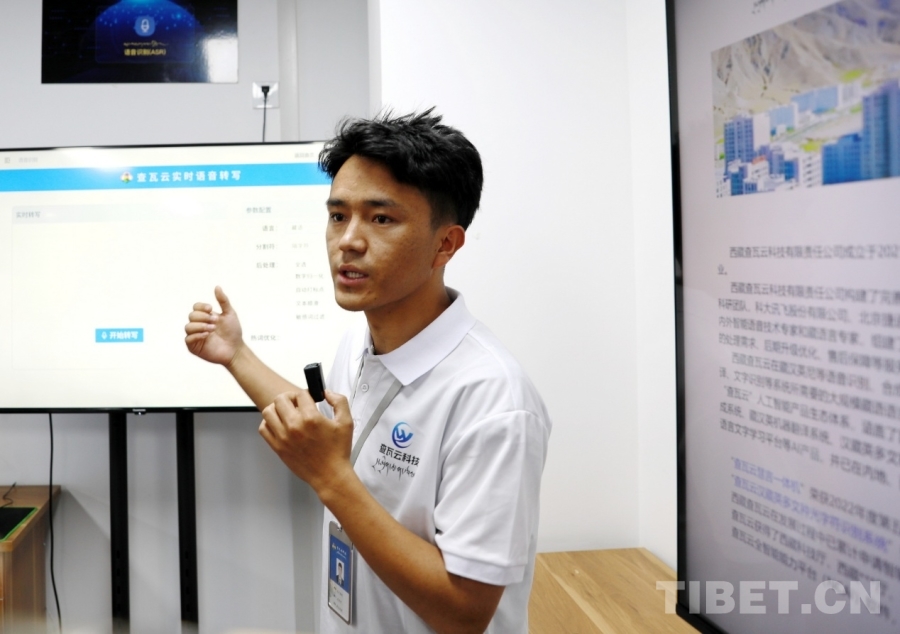 圖為西藏查瓦云科技有限責任公司副總經理次仁桑珠介紹查瓦云實時語音轉寫系統(tǒng) 攝影:劉莉