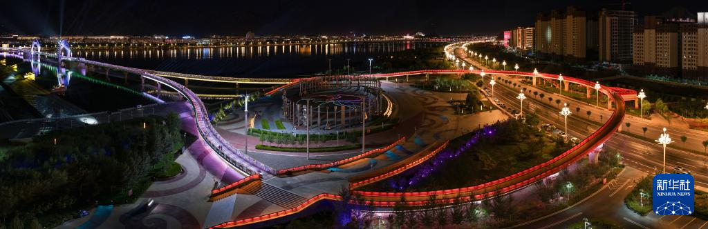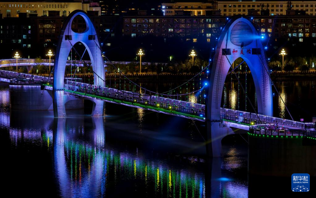 這是7月30日拍攝的拉薩河夜景,由近及遠(yuǎn)分別是和美橋、柳梧大橋和連心橋(無人機(jī)拼接照片)。新華社記者 姜帆 攝 ??