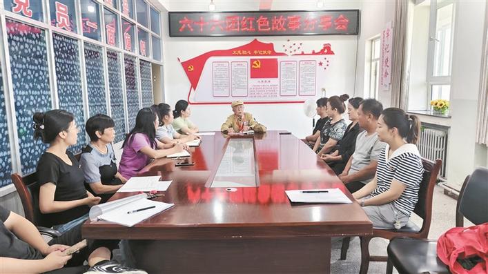 在四師六十六團舉辦的紅色故事分享會上,老戰(zhàn)士宣講團成員閆欣秋為職工群眾講述兵團故事(攝于7月17日)。 兵團日報常駐記者 李惠 通訊員 武淑洋 攝