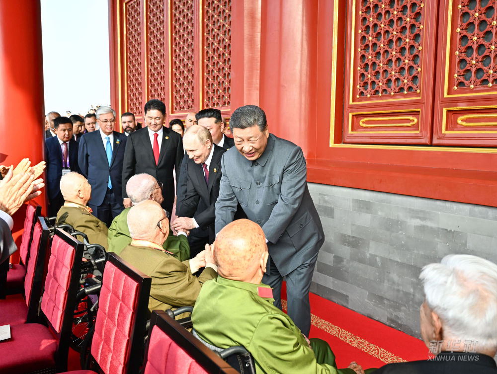 9月3日上午,習近平等登上天安門城樓。習近平同抗戰(zhàn)老戰(zhàn)士老同志代表親切握手,向他們表示崇高敬意。