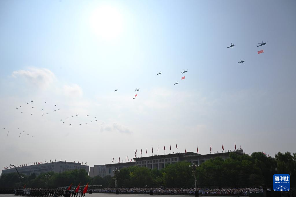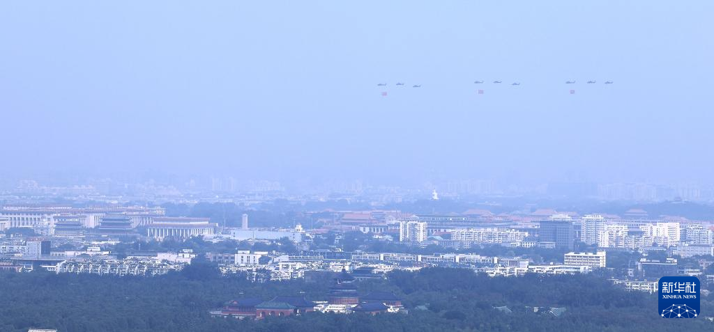 9月3日,紀(jì)念中國人民抗日戰(zhàn)爭(zhēng)暨世界反法西斯戰(zhàn)爭(zhēng)勝利80周年大會(huì)在北京隆重舉行。這是空中護(hù)旗梯隊(duì)通過天安門廣場(chǎng)。
