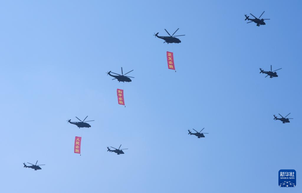 9月3日,紀(jì)念中國人民抗日戰(zhàn)爭(zhēng)暨世界反法西斯戰(zhàn)爭(zhēng)勝利80周年大會(huì)在北京隆重舉行。這是空中護(hù)旗梯隊(duì)。