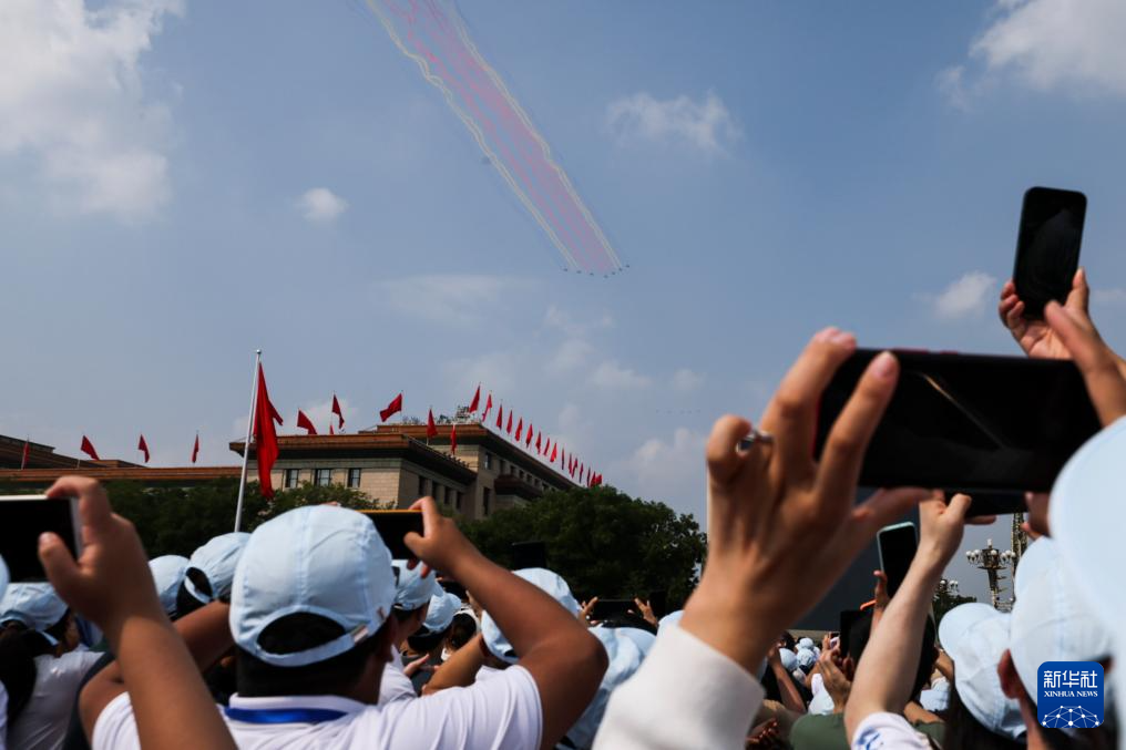 9月3日,紀(jì)念中國(guó)人民抗日戰(zhàn)爭(zhēng)暨世界反法西斯戰(zhàn)爭(zhēng)勝利80周年大會(huì)在北京隆重舉行。這是觀眾拍攝教練機(jī)梯隊(duì)接受檢閱。