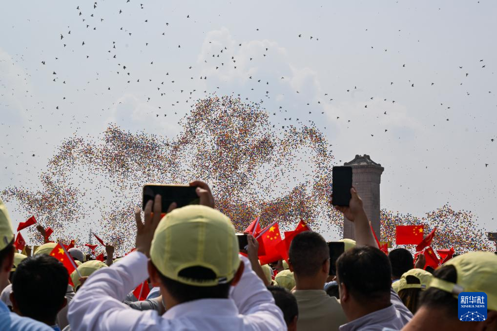 9月3日,紀(jì)念中國(guó)人民抗日戰(zhàn)爭(zhēng)暨世界反法西斯戰(zhàn)爭(zhēng)勝利80周年大會(huì)在北京隆重舉行。這是觀眾拍攝紀(jì)念大會(huì)現(xiàn)場(chǎng)放飛氣球和鴿子。