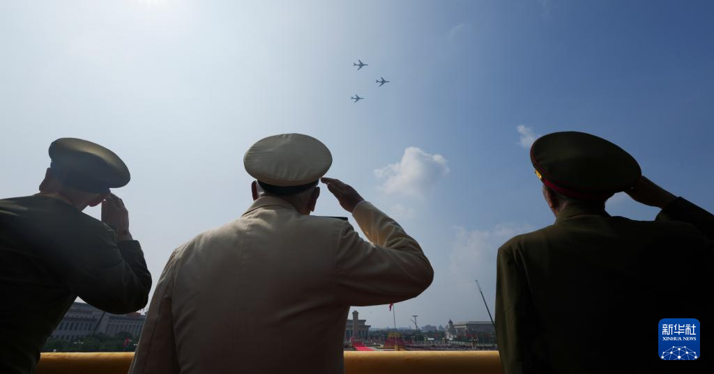9月3日,紀(jì)念中國(guó)人民抗日戰(zhàn)爭(zhēng)暨世界反法西斯戰(zhàn)爭(zhēng)勝利80周年大會(huì)在北京隆重舉行。這是轟炸機(jī)梯隊(duì)飛過(guò)天安門廣場(chǎng)上空時(shí)嘉賓敬禮。