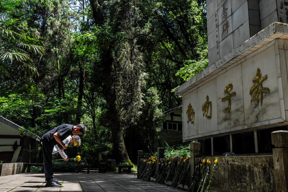 2025年7月18日,在昆明市西山森林公園,張云鵬(前)和妹妹張昆玉向南洋華僑機工抗日紀念碑鞠躬。
