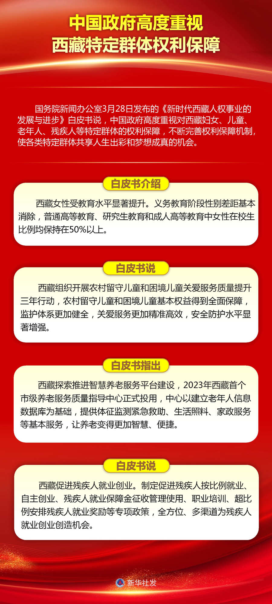 國務(wù)院新聞辦公室28日發(fā)布的《新時(shí)代西藏人權(quán)事業(yè)的發(fā)展與進(jìn)步》白皮書說,中國政府高度重視對(duì)西藏婦女、兒童、老年人、殘疾人等特定群體的權(quán)利保障,不斷完善權(quán)利保障機(jī)制,使各類特定群體共享人生出彩和夢(mèng)想成真的機(jī)會(huì)。