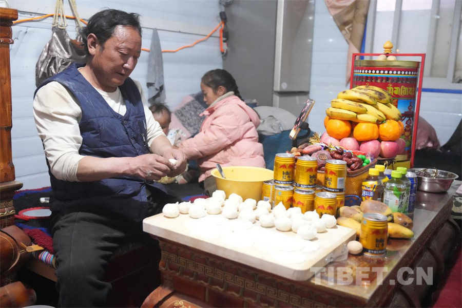 圖為震后的第一個節(jié)日“日喀則農(nóng)事新年”。這一天恰逢日喀則農(nóng)事新年古突夜與農(nóng)歷春節(jié)除夕相遇在同一日。在定日縣曲洛鄉(xiāng)措昂村安置點內(nèi),拉華一家正在包藏式餃子慶祝這一天(攝于2025年1月28日) 攝影:旦曲