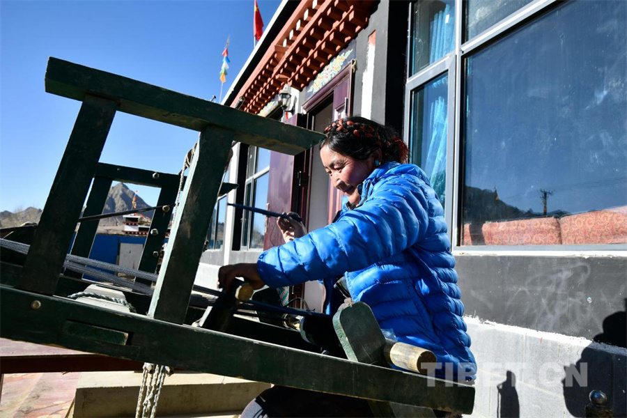 圖為定日縣協(xié)格爾鎮(zhèn)奶色姆村的次仁拉宗在新居前笑容燦爛地紡織毛線(攝于2026年1月5日)攝影:趙振宇