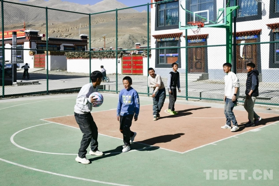 圖為在定日縣長(zhǎng)所鄉(xiāng)森嘎村的籃球場(chǎng)上,一場(chǎng)籃球?qū)Q正在開(kāi)展。攝影:趙振宇