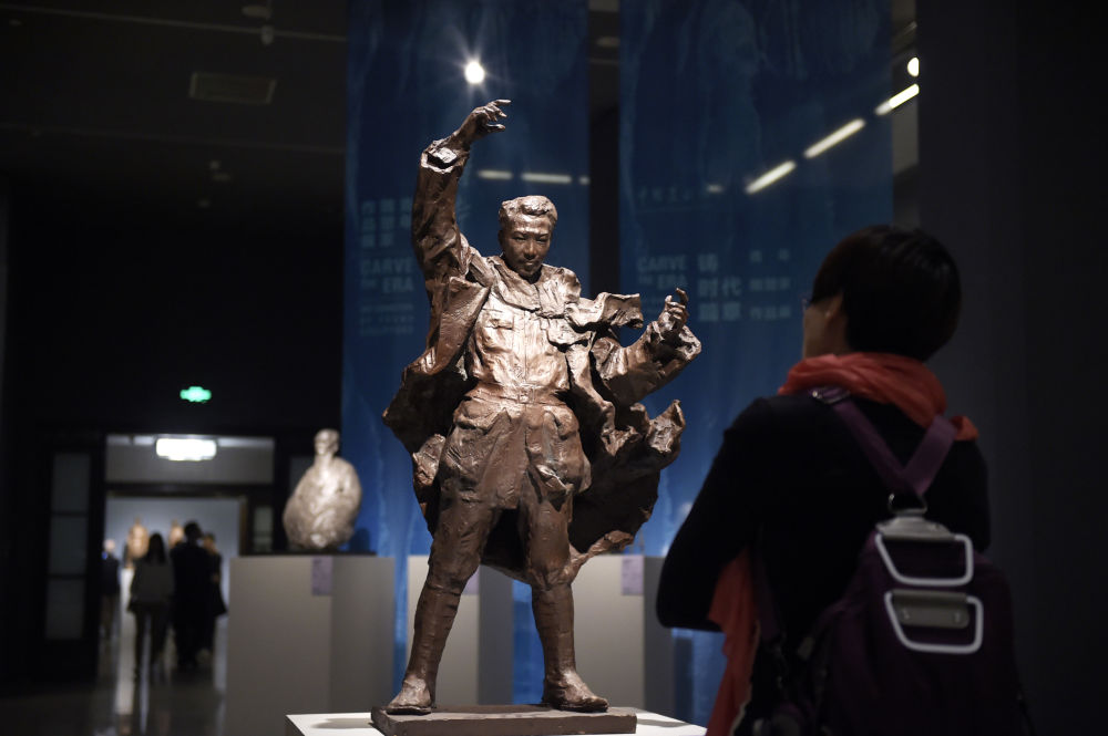 2018年4月1日,參觀者在北京的中國(guó)美術(shù)館參觀雕塑作品“冼星?!薄?/p>