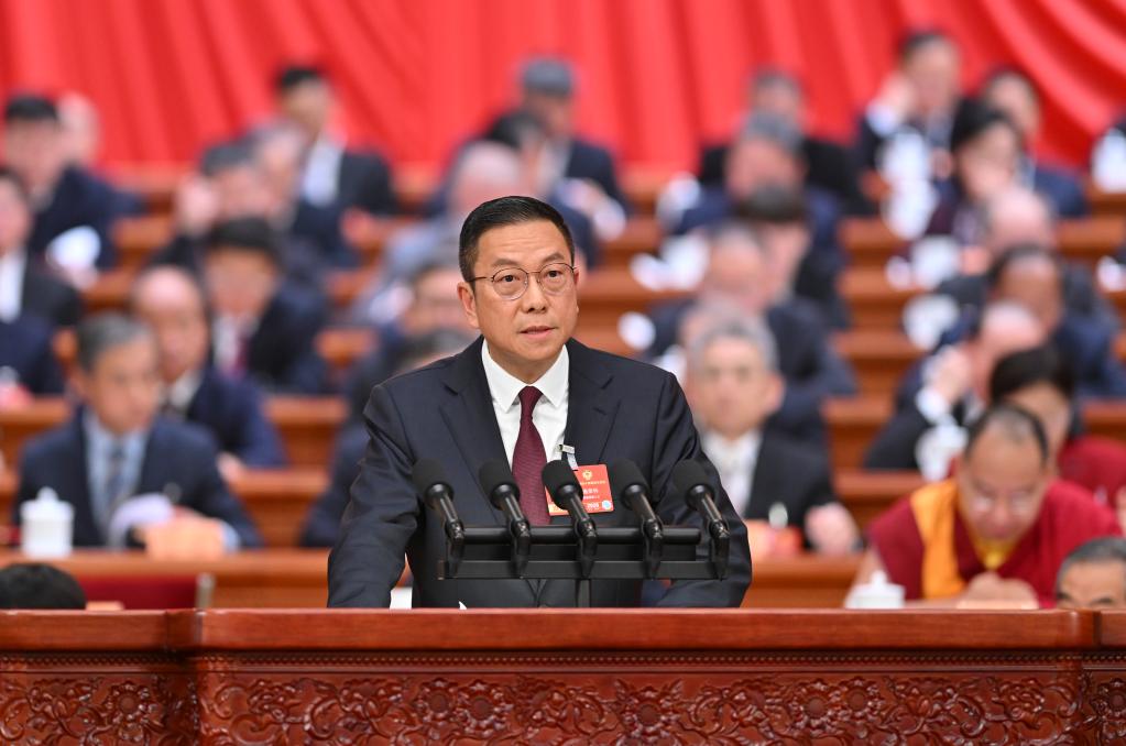 3月8日,全國政協(xié)十四屆四次會議在北京人民大會堂舉行第三次全體會議。這是楊明杰委員作題為《穩(wěn)步推進落實四大全球倡議 推動構(gòu)建人類命運共同體》的發(fā)言。新華社記者 岳月偉 攝