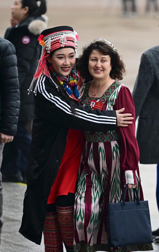 3月4日,中國人民政治協(xié)商會(huì)議第十四屆全國委員會(huì)第四次會(huì)議在北京人民大會(huì)堂開幕。這是楊鈺尼委員(左)與木合拜爾·阿布都爾委員一起步入會(huì)場。