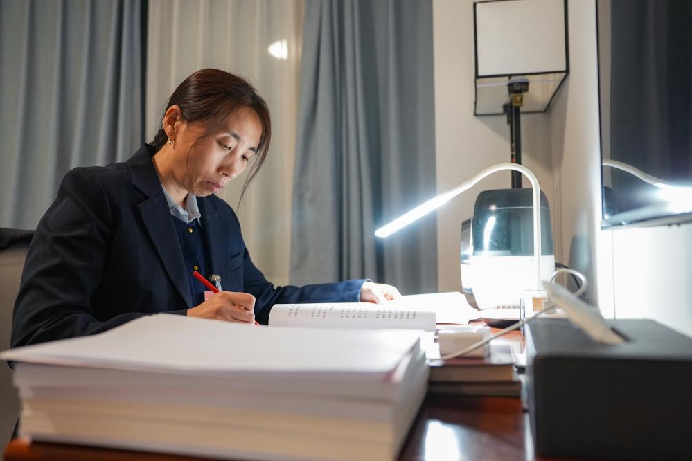 3月6日,郭紅靜代表在天津代表團(tuán)駐地閱讀政府工作報(bào)告。新華社記者 王曦 攝