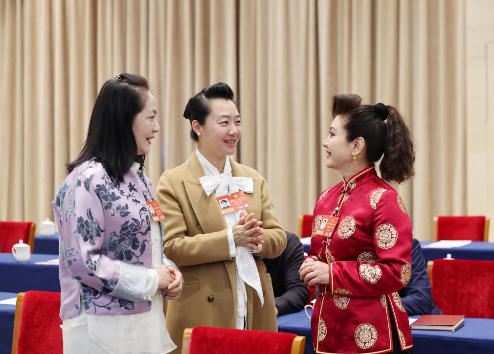 3月6日,全國政協(xié)委員迪麗娜爾·阿布拉(右)、周利(中)和苗潔在文化藝術(shù)、體育界委員聯(lián)組會(huì)前交流。新華社記者 姚大偉 攝