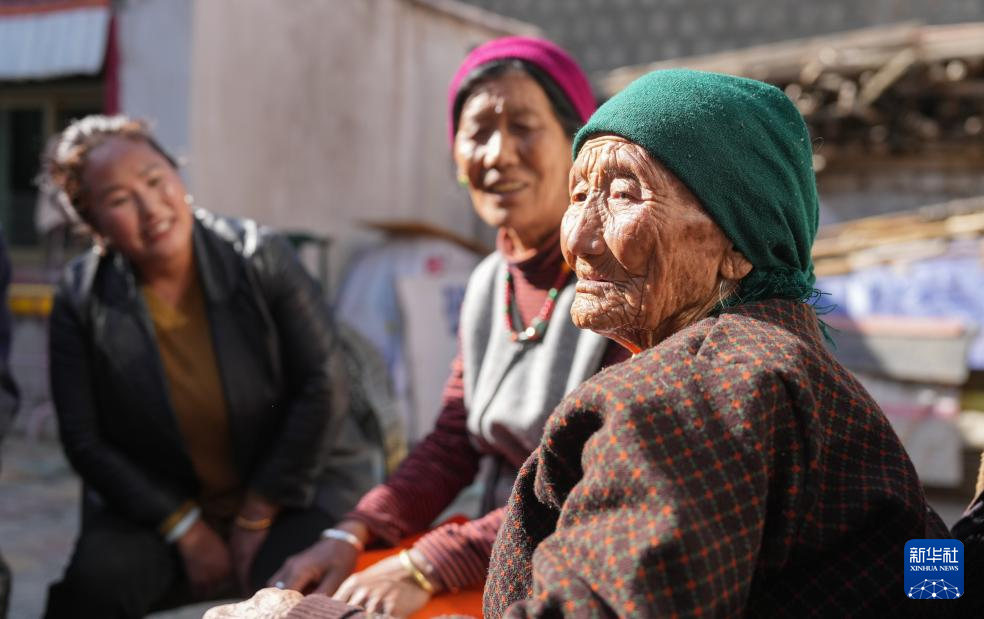 某朗桑姆(中)跟女兒及街坊開玩笑(3月20日攝)。新華社記者 晉美多吉 攝